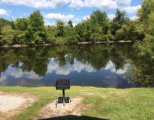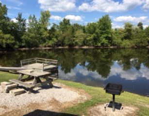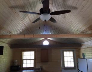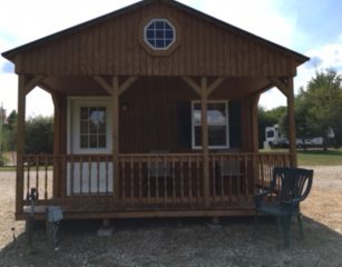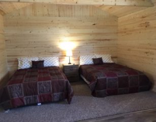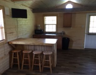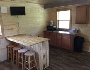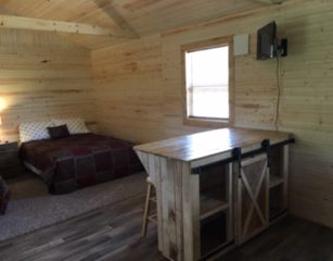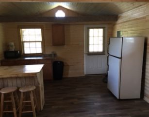 This is cabin 4 spacious 14×28 it has a 6ft porch facing the lake, 2 full beds, full size fridge, bar and counter with microwave and coffee pot, t.v., a/c and heat. It sets right on our small lake has a park style grill and fire pit with picnic table.