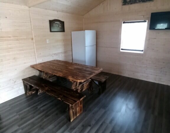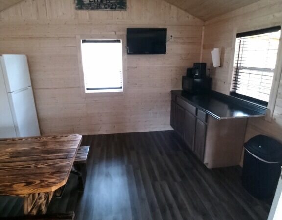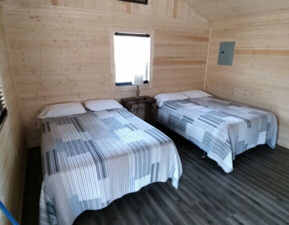 Cabin 2 is a spacious 14×24 it has two full size beds, The cabin has air, heat, television, microwave, fridge, coffee pot, and farm table with benches.It has laminate floors and is finished in tongue and grove pine from floor to celling, We have outdoor park style grills at each cabin along with picnic tables, also each cabin has a fire pit.