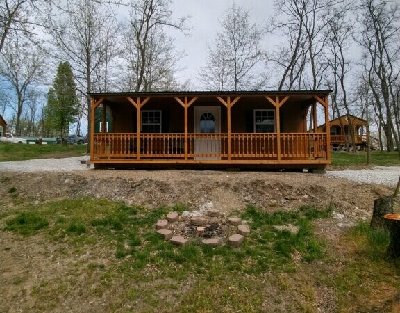 Cabin 1 is a spacious 14×28 with a 6ft porch it has 2 full beds, farm table, counter with microwave, coffee pot, toaster, a/c, heat, full size fridge, park style grill, fire pit, picnic table, and is landscaped It is also close to the shower house.
